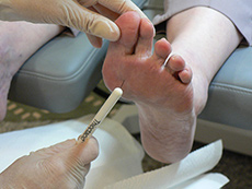 Zur Basisprüfung bei einer diabetischen Fußbehandlung gehört die Inspektion der Füße. Es folgt die Palpation der Fußpulse. Zusätzlich wird die Untersuchung des Vibrationsempfindens mit der Stimmgabel durchgeführt. Das Berührungsempfinden wird mit einem Mikroflament und das Tastaturempfinden mit dem Tiptherm überprüft. Sind offene Stellen an den Füßen vorhanden wird der Patient zur Abklärung zu seinem behandelnden Arzt geschickt. Erst danach erfolgt die weitere Behandlung des Patienten.