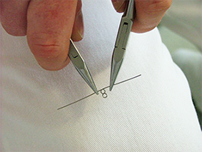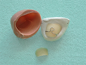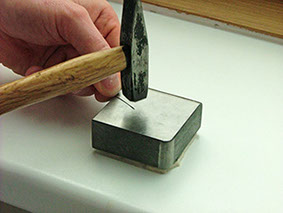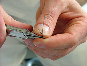 Die Schlaufe muss orthogonal ausgerichtet sein. Beide Schenkel müssen sich auf einer Ebene befinden. Die Enden der Schenkel werden flach geklopft und entgratet. Die fertige Spange wird auf das Nagelmodell aufgesetzt und später am Originalnagel angepasst.