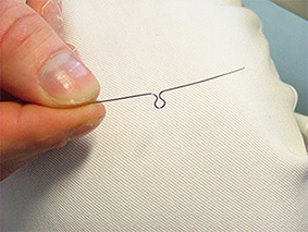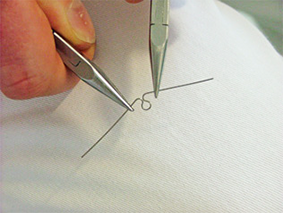 Zuerst wird mit dem Draht eine Schlaufe gebogen. Darauf folgt eine zweite Biegung des Drahtes. Die Schlaufen werden auseinander gezogen. Die Omegaschlaufe ist entstanden.